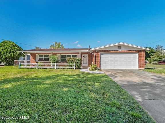 Beautifully remodeled 3-bedroom, 2-bath concrete block home with a 2-car garage, gracefully set on a corner lot. The timeless brick exterior and white accent fencing instantly create that warm, country-style charm, while the spacious fenced backyard and screened porch offer the perfect Florida outdoor lifestyle. Pride of ownership shines throughout. Lovingly cared for and improved over the past seven years, this is truly a move-in-ready home you'll be proud to call your own.  Inside you're greeted by a bright, open-concept living space filled with natural light and warmth. The home has been tastefully updated, featuring luxury vinyl plank flooring that runs throughout the main areas. The remodeled kitchen is a showstopper — boasting granite countertops, stainless steel appliances, white shaker cabinets, stylish hardware, and a large center island that seamlessly connects to the dining and living spaces. Your split master suite offers privacy with a fully updated en-suite bath featuring a walk-in shower. Two additional bedrooms are perfect for guests, children. Each filled with charm and natural light. The sunroom/flex space is a is a standout feature surrounded by windows and drenched in sunlight, it's perfect as a dining area, home office, or hobby space with peaceful backyard views. Step out to your large, screened porch with a trussed roof, the ideal spot for relaxing, dining, or watching rocket launches streak across the sky. Located just a few streets from Coquina Elementary and less than five minutes from the Indian River, this home offers both serenity and convenience.
