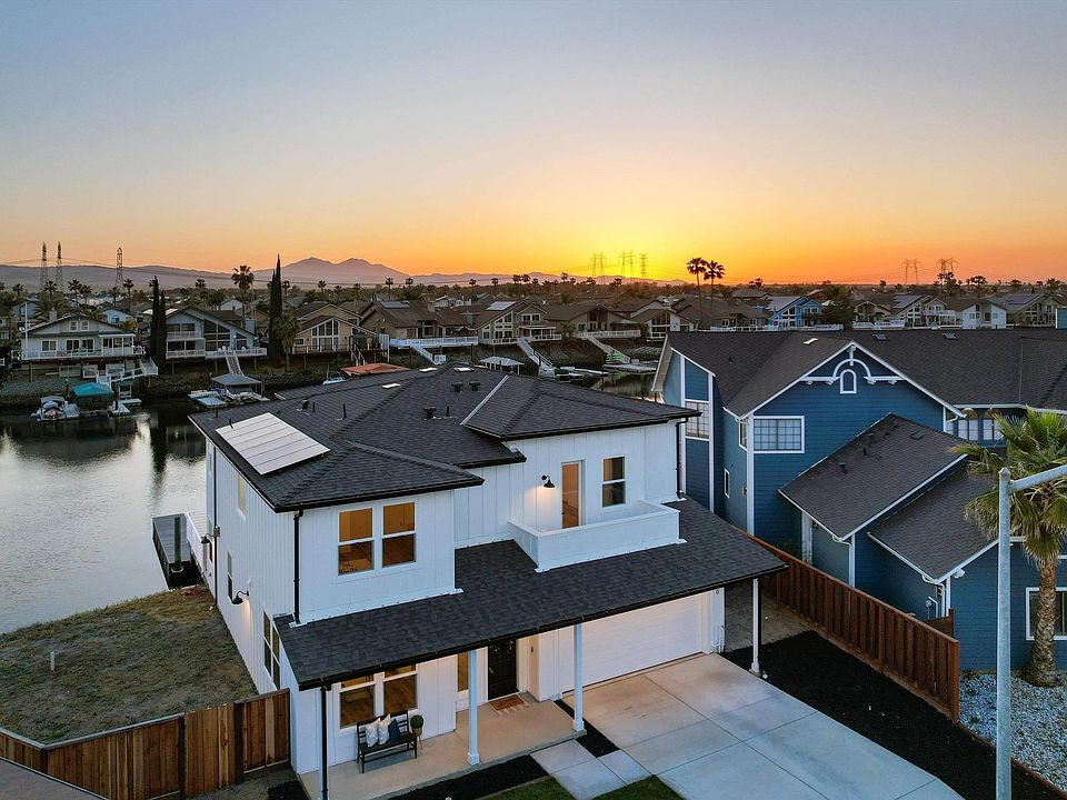 If you've been dreaming of waterfront living, your dreams are about to come true! This builder thought of everything! Primary & Junior Primary Suites (Jr Primary comes with a balcony), 1st floor bedroom or office/den, Quartz stacked stone fireplace wall, Owned solar (10 panels), two-zone HVAC, walk-in closets, beautiful luxury vinyl plank wood flooring, high-end light fixture selections, tankless water heater & 2-car deep garage. The natural light coming into this home is fabulous with windows & sliders overlooking the water & Mt Diablo. The gourmet Kitchen features Dacor appliances with a dual fuel 48" range oven, a separate wall oven/microwave combo, dishwasher & hood, 42" built-in refrigerator, custom cabinetry, Quartz countertop & backsplash & large island. The Primary Suite provides breathtaking water & mountain views, a large en Suite w/ Piedrafina Marble, a freestanding tub & dual vanities. Step outdoors & enter your water-life paradise. With plenty of room for your water toys & outdoor gatherings, possible side-yard access, Fiberon decking with PVC materials & a white power coated steel railing. Aluminum Gangway ramp/decking & a U-shaped dock prewired for a power pedestal on the dock. Come live your best life on the water in Discovery Bay.