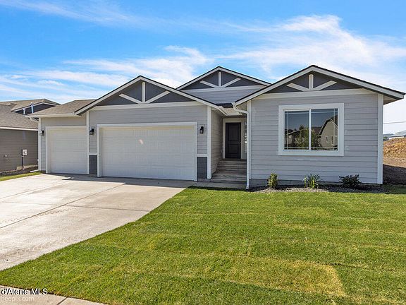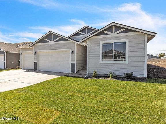 Welcome to Hydrilla Estates a quaint new subdivision in Post Falls Idaho. This well thought out rancher features cathedral ceilings and open floor concept through the family room, dining room and kitchen. The Kitchen features 42'' upper cabinets, an island with eating bar overhang, walk-in pantry and stainless appliances. The primary bedroom features a full ensuite bath with double sinks, garden tub and 5' fiberglass shower. There is a full guest bathroom between the guest bedrooms and located off the three-car garage you will also find a laundry/Mudroom. Estimated completion date 10/1/25.