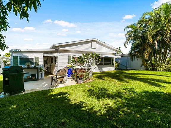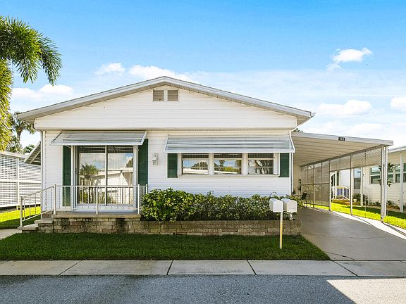 Move-In Ready! Spacious & well-maintained 2-bedroom, 2-bath mobile home in the highly sought-after Hidden Harbour 55+ community. This fully furnished home features a bright open floor plan with laminate flooring in main areas & carpet in bedrooms. Enjoy a large living room, dining area, & functional kitchen layout. The enclosed carport adds privacy & usable space, & the backyard features an open patio plus an attached storage building with washer & dryer. Updates include a new A/C (2020) & accordion hurricane shutters (2022). Community amenities: Clubhouse with pool, shuffleboard, community room, marina access (fee/availability), & on-site manager. Monthly fee includes: Basic cable, water, sewer, lawn care, trash, & use of recreational facilities. Buyer requirements: No rentals or pets allowed. Buyer must complete application, background check, & interview for approval. Close to beaches, golf, parks, dining, & morethis home offers easy Florida living in a vibrant, active community.