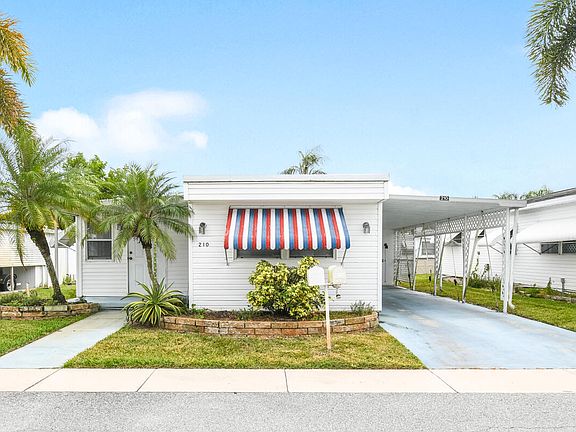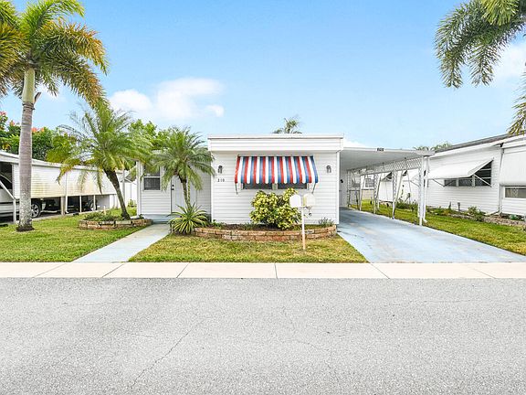 Spacious and well-maintained 2-bedroom, 1-bath mobile home in the highly sought-after Hidden Harbour 55+ community. This furnished home features an open floor plan with laminate and linoleum flooring throughout. Enjoy a large living room, dining area, and a functional kitchen layout. Enclosed carport adds privacy and usable space plus attached storage building with washer and dryer. Updates include new A/C (2017). Community amenities: Clubhouse with pool, shuffleboard, community room, marina access (fee/availability), and on-site management. Monthly fee includes: Basic cable, water, sewer, lawn care, trash, and use of recreational facilities. Buyer requirements: No rentals or pets allowed. Buyer must complete application ($50 fee), background check ($70 pp) and interview for approval. Close to beaches, golf, parks, dining, and morethis home offers easy Florida living in a vibrant, active community. Boat slips $3.24/foot when available and off premises fenced boat storage yard.