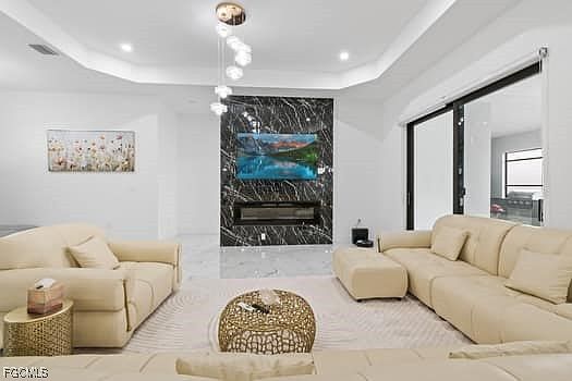 From the moment you approach the front of the house, you'll be captivated by the manicured lawn and impressive impact French doors that stand 8 feet high and 6 feet wide. Step inside to find a cavernous living area filled with an abundance of natural light, thanks to impact windows throughout the home. High 10-foot tray ceilings add to the spacious, airy atmosphere.