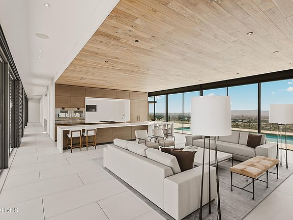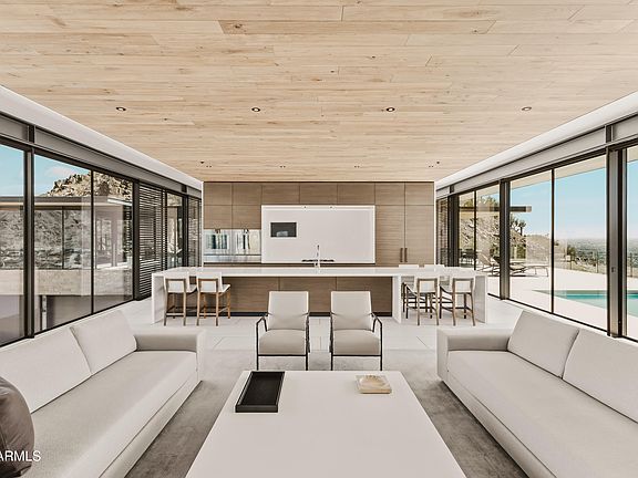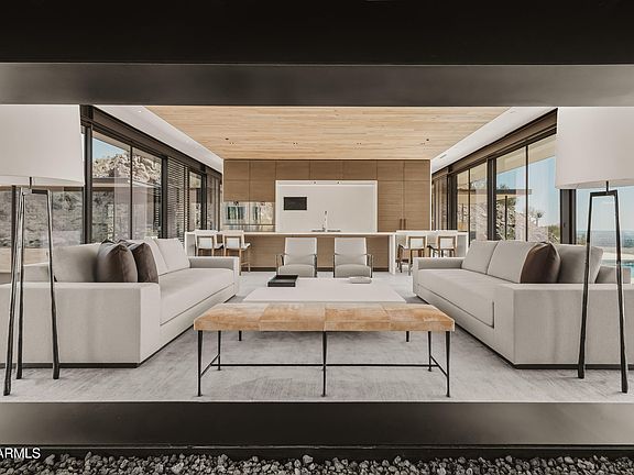 Commanding a premier 3.45-acre mountainside site in Paradise Valley, this modern estate by renowned builder The Construction Zone is a rare offering for those who expect perfection. Crafted from steel, glass, and stone, it stands as an architectural showpiece of breathtaking scale and precision. A dramatic, light-filled entry opens to soaring volumes and curated finishes, while walls of glass frame panoramic views of sunsets, city lights, and mountain silhouettes. Retractable walls create seamless indoor/outdoor living with elevated terraces, refined lounges, and a striking rooftop pool for sophisticated entertaining. Inside, luxury unfolds through expansive Neolith flooring, warm oak-planked ceilings, precision steel detailing, and custom millwork. The primary suite features dual illuminated dressing rooms and two resort-level spa baths, including a sculptural soaking tub and an indoor/outdoor shower with starlit views. A glass-clad office pavilion offers 360-degree vistas, a lounge, custom fireplace, and steel-clad bar. Additional amenities include a Dolby Atmos theater, fully equipped fitness suite, guest quarters, secondary laundry, and a conditioned four-car garage with adjoining flex space. Fully automated with Crestron and served by an elevator, this private estate defines effortless luxury and architectural excellence.