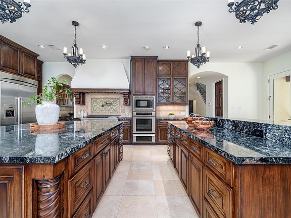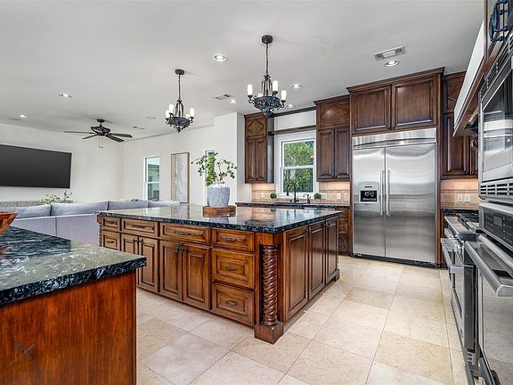 The chef’s kitchen features premium appliances, custom cabinetry, and a large island designed for both entertaining and everyday living.