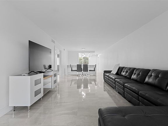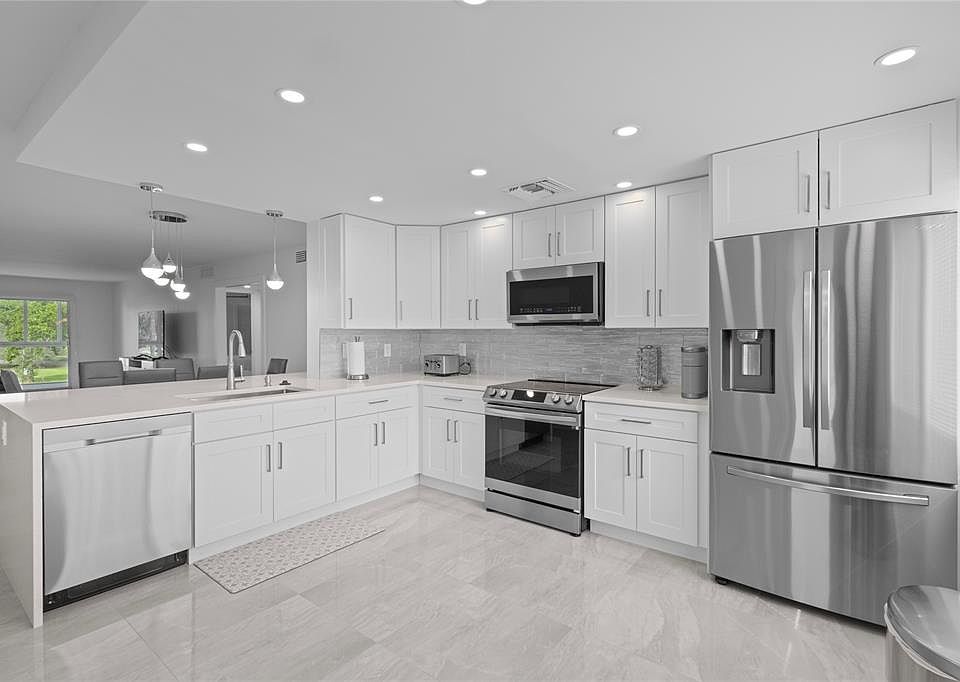 Serene lakefront viewQuartz waterfall countertopCustom finishesVinyl tile floorsImpact windowsSamsung appliancesLarge sparkling porcelain tile