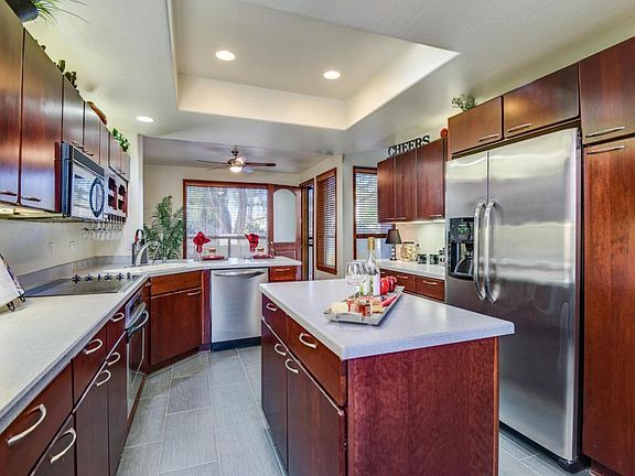 A Must See! Bright and Open Floor Plan with Vaulted Ceilings. Rich wood accents and hardwood floors through out. Updated Kitchen with custom Cherry Cabinets, Corian Counters and SS Appliances. Dramatic built in cherry bookcases and ceiling fan in the livingroom. Very Large Masterbedroom with vaulted ceiling, large windows and gas fireplace. Large Updated masterbath and large walkin closet with built ins. Bed 2 is large with separate custom bathroom and walkin closet with built ins. Beautifully maintained gated community with pool. Two car garage attached with opener. Private Fenced yard with nice patio. Call to see it. Landlord pays Association Fees, Water, Refuse, Sewer