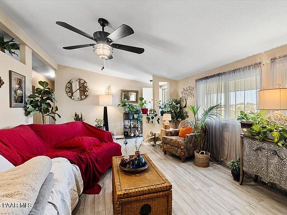 Perched in the heart of Prescott Valley's Unit #8, this beautifully upgraded manufactured home captures breathtaking panoramic views of the Mingus and Bradshaw Mountains from its inviting covered front porch. Step inside to a bright and airy living room where vaulted ceilings and luxury vinyl plank flooring create a spacious, welcoming atmosphere. The open floor plan flows seamlessly into the stunning kitchen, featuring granite countertops, a sleek subway tile backsplash, and newer stainless steel appliances--including a French-door refrigerator and a 4-burner gas range with convection oven. Whether hosting formal dinners in the adjoining dining room or enjoying a relaxed breakfast at the kitchen's bar, this home is designed for comfort and connection.The primary suite offers a serene retreat with vaulted ceilings, dual closets, and a luxurious ensuite bathroom boasting a stunning walk-in shower and modern vanity. Each additional bedroom continues the home's sense of space and style with vaulted ceilings and generous walk-in closets. A thoughtfully designed laundry room adds function and charm, complete with built-in cabinetry, a folding station, and a utility sink.The exterior showcases timeless curb appeal with a fenced yard, extended covered porch, and paver firepit area--perfect for entertaining guests or relaxing while taking in the sweeping mountain vistas--along with a detached 1.5-car garage/workshop featuring a wired workbench and a 3-car attached carport for added convenience, all enhanced by recent upgrades including newer windows, plumbing, HVAC, and a brand-new roof in 2025 for lasting peace of mind.
