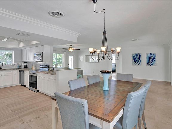 Recently renovated, spacious, turn-key three bedroom and two-bathroom pool home with a one-car garage and circular driveway in highly desired Lighthouse Point. Large open plan living/dining room area with travertine floors throughout. Fully remodeled kitchen, bar counter, white Shaker cabinetry, beautiful marble counters and stainless steel appliances. Split bedroom plan. Large primary bedroom suite includes remodeled ensuite bathroom and cedar walk-in closet. Impact windows, newer electrical boxes and newer outside air conditioning unit. Large, fully landscaped, fenced backyard is great for entertaining. Completely turn-key for AirBnB vacation or long-term rentals. The furniture is available for purchase. Make this wonderful house your easiest move ever.