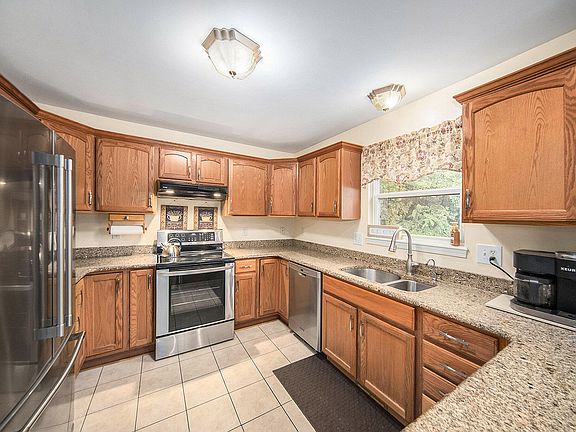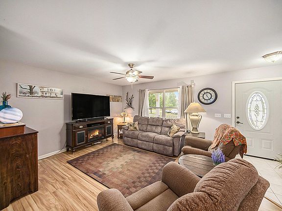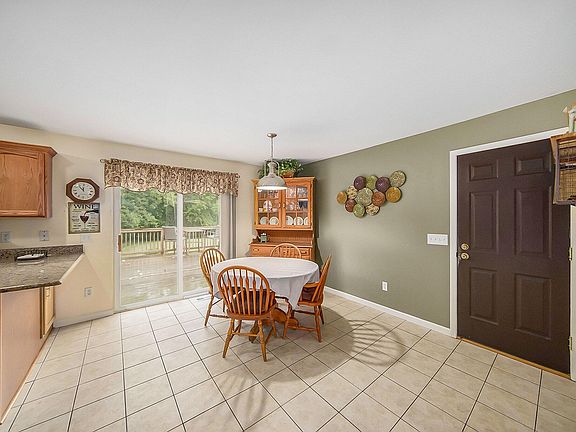 Welcome home to this inviting 3 bed/3 bath ranch tucked away on a peaceful acre at the end of a cul-de-sac! Inviting covered front porch greets you while inside you'll find an open floor plan that makes everyday living & entertaining a joy. The tiled kitchen & dining area sparkle with granite countertops, stainless steel appliances & a doorwall that opens to a spacious deck overlooking the private backyard. The adjoining living room with LVP flooring iprovides a comfortable gathering space. The primary suite fincludes a private tiled bath, while two additional bedrooms share the 2nd full tile bath. The full finished w/out basement nearly doubles your living space, with family & rec areas, a convenient laundry closet, plenty of storage & direct access to a patio & fire pit for cozy evenings outdoors. Surrounded by woods with nothing but nature behind you, this setting offers exceptional privacy. A finished 2-car attached garage & extra storage shed make this home make this home as practical as it is charming. A wonderful blend of comfort, space, and seclusionready for you to enjoy!