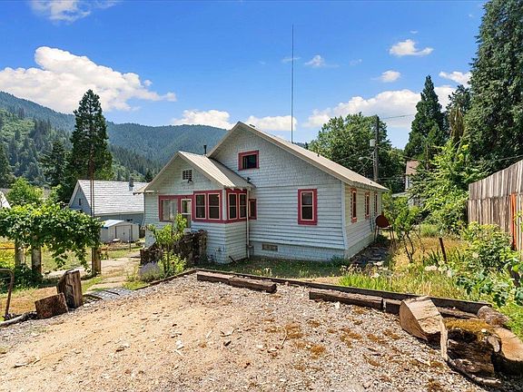 This Dunsmuir Charmer is approximately 1500 square foot 3 bed one bath which sits on a double city lot that is zoned R-3 and close to town. Owner thinks the house was built in the late 1800's. There's lots of character in this home, hardwood floors, wood cased windows, built in wooden cabinets and shelfing, cedar paneling on some walls, wooden French doors between the living room. and dining room, a five foot old claw foot tub in the bathroom which is connected to two bedrooms, kitchen has an old gas cooking stove. It is heated buy a newer wood stove and monitor and has a full basement with a one car garage underneath. So much potential to restore this classic old farm house.