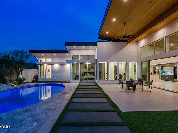 Stunning new construction on one of the highest elevation lots in the estate! This amazing home was designed by renowned local architect James Kottke to maximize the large 16,000sqf RARE corner flat lot and gorgeous views of Camelback Mountain. The popular Marion Estates is only minutes away from shopping, dining and entertainment. The home itself has that WOW factor as you enter and are immediately greeted with 15' soaring ceilings and a 24' sliding window system that opens the space for a completely integrated indoor/outdoor entertainment experience. The backyard is complete with covered patio and gas fireplace overlooking the new pool with travertine decking throughout and a deluxe BBQ area with outdoor kitchen, TV and pergola The home itself offers a large custom designed kitchen with Dacor appliances including a 42" counter depth fridge, 80" tall wine chiller, 36" chef's smart wifi gas oven and a built in smart coffee machine.