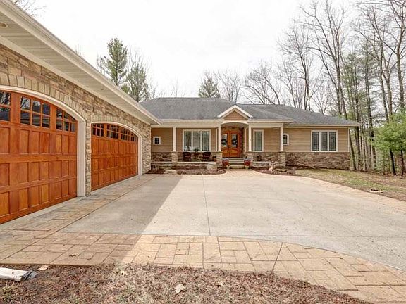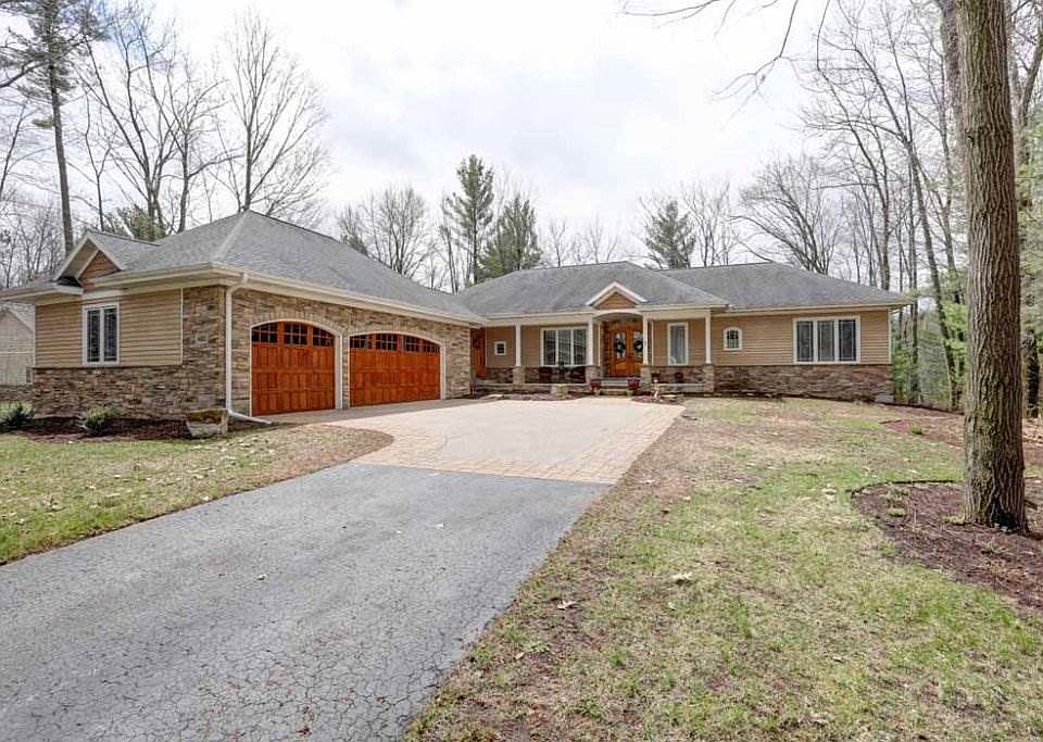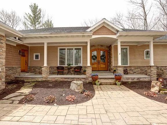 Executive ranch home nicely setback w/ great curb appeal! This well-maintained home offers River, exceptional woodwork, quality & appeal, amazing views, gourmet kitchen, spacious open concept living w/ 9' ceilings on main and lower level, two way fireplace w/ tile surround, & custom built-in cabinets / bookshelves, floor to ceiling window facing south towards the water!Additionally, the main level holds tons of character & quality throughout, archways, unique ceiling variations, quality woodwork / stonework, great flow, executive feel, 9' ceilings throughout, recently painted, and new locks on main level doors, large 8 x 9 foyer w/ a double door, dining room w/ tray ceiling and crown molding, kitchen w/ granite countertops, maple cabinetry & solid hardwood flooring, reverse osmosis system, breakfast bar, gas cooktop, ample cabinet space, eat-in nook, large electric double oven, butler pantry/office space, sunroom w/ walkout patio access, tall window surround and small wet bar w/ mini refrigerator included, master suite w/ huge walk-in closet (13x9) w/ built-in shelving, master bath w/ amazing river views, jetted tub, walk-in shower, dual vanity, and tons of space, spacious main level laundry / powder room and 1/2 bath, lower level w/ great entertainment space, knotty pine walls, 9 ft ceilings, huge patio doors, custom bar area with wood bar top, wine cooler, sink, speaker system, and pool table included! Plus, two way gas fireplace in the family room / theater room, in-floor heat in lower level & upper level, newer water heater (2018), furnace / A/C in attic, whole house water filter system, refrigerator in lower level utility room included, cedar w/ stone accent exterior, all new landscaping, freshly mulched (2019), professionally stained (2017), in-ground sprinkler systems, and a spacious 3 car garage 7'x8' with arched ceiling.