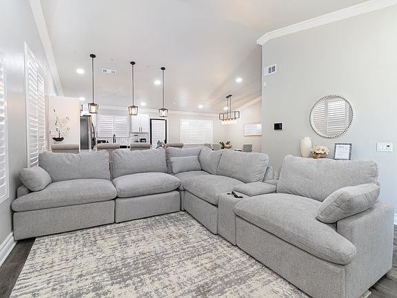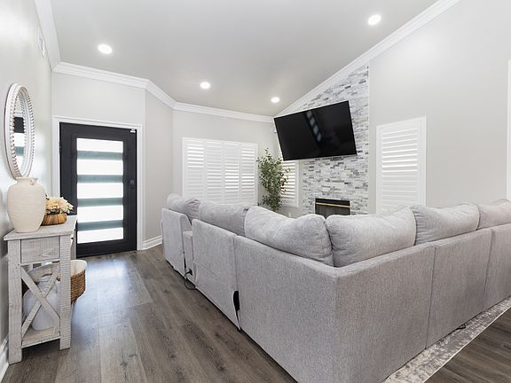 *Spacious Living Areas: Large reclining sectional sofa, custom fireplace, crown molding, and hardwood floors throughout.