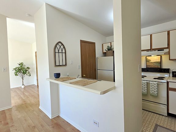 Vaulted ceilingsBreakfast barGood size closet