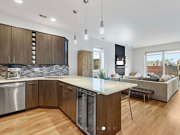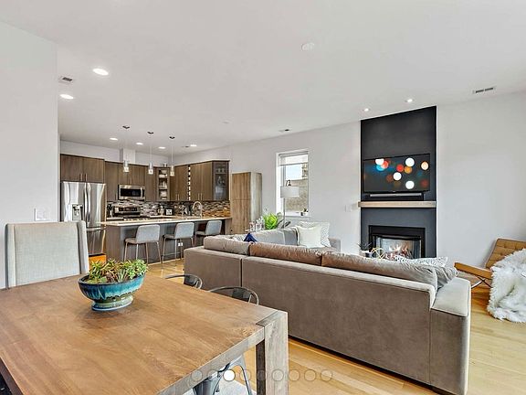 Enjoy a large private rooftop deck with skyline views perfect for entertaining or relaxing plus a front balcony for your morning coffee. Inside, the modern open kitchen features stainless steel appliances, dual beverage fridges, and an inviting gas fireplace in the living area.