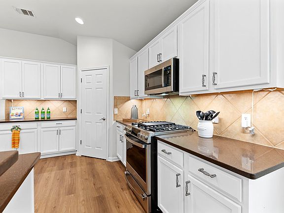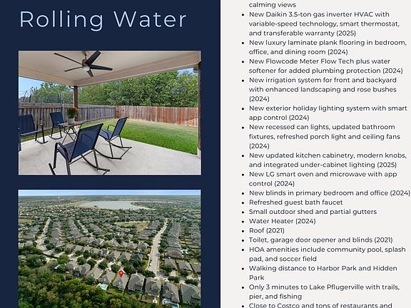 Backed against a private GREENBELT with a TON of recent updates + a short walk to Lake Pflugerville!! This meticulously maintained home features a NEW (2025) Daikin 3.5-ton gas inverter HVAC that includes a smart thermostat and transferable warranty, along with (2024) luxury laminate plank flooring. Inside, you’ll find an additional flex room that can serve as a home office or be converted into an extra bedroom, soaring 10-foot ceilings that fill the home with abundant natural light, and a spacious kitchen with ample cabinetry and elegant quartz countertops. A Flowcode Meter Flow Tech and water softener further protect plumbing and water quality. Other 2024 updates include an irrigation system that services both the front and backyard with enhanced landscaping and rose bushes. Lighting upgrades feature a holiday lighting system with smart app control, recessed can lights, updated interior fixtures, and refreshed porch light and ceiling fans. Interior touches include blinds in the primary bedroom and office, along with a refreshed guest bath faucet. The kitchen was updated with newly painted cabinetry, modern knobs, integrated under-cabinet lighting, and LG smart appliances. The roof age is 2021, with partial gutters, and the water heater is 2024. The HOA offers a community pool, splash pad, and soccer field, while Harbor Park and Hidden Park are just a short walk away. Enjoy the sandy beaches of Lake Pflugerville just three minutes from your door with trails, a pier, and weekend recreation, and Costco, restaurants, and entertainment are all nearby for everyday convenience.