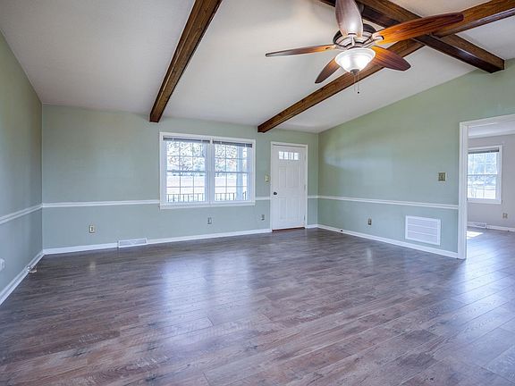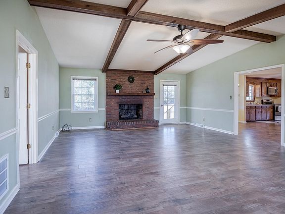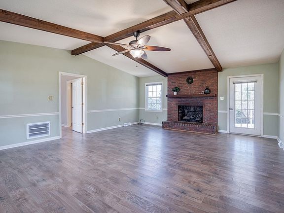 Gorgeous brick fireplaceSpacious great roomBeautiful wood beamsCovered back patioTwo large storage sheds