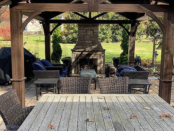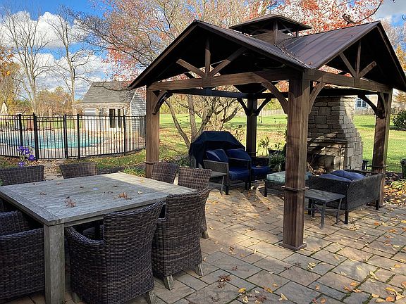 This updated colonial in Middletown will not last long! Situated on 3.23 acres this gorgeous home features hardwood floors throughout entire house, updated kitchen with stainless steel appliances, wall oven and microwave/convection wall oven, huge center island, and granite counter tops. The sunk-in family room has a stone fireplace (gas) with french doors that lead to sunroom. Upstairs are 4 large bedrooms and an updated hall bathroom with Carrera marble counter tops. The primary bedroom has a custom built-in headboard, updated bathroom with granite counters, granite tile in shower and bamboo flooring. The finished basement features 1/2 bath, new custom bar with granite counter tops, laundry/storage room, and Life Proof LVP flooring. Outside is a 1000 sq. ft. paver patio, with outdoor stone fireplace and pergola. The in-ground pool has a new liner, is 10.5 feet deep and has a pool house with lounge area, kitchenette and is wired for cable and electric. New Trane HVAC system (dual zone) with a 5 year warranty. Approx. 6 months left on lawn treatment service will convey at no cost to buyer.