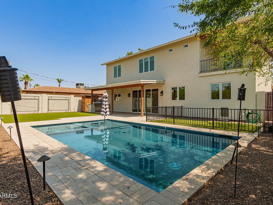 Stunning 2017 Custom Home in the Coveted Tavan School District. Located in one of Arcadia's most desirable neighborhoods, this home offers modern elegance and effortless living. The light-filled, open-concept floor plan features engineered oak flooring throughout, soaring 9-foot ceilings, and breathtaking views of Camelback Mountain. Designed with entertaining in mind, the chef's kitchen showcases a spacious island, farmhouse sink, double ovens, butler's pantry, and premium Electrolux refrigerator and freezer. The flexible layout includes a full guest suite on the main level. Upstairs, discover a generous loft, two ensuite bedrooms, and a luxurious primary suite complete with a private balcony, large walk-in closet, and stunning mountain views. Step outside through oversized Arcadia doors to a private backyard oasis with a heated pool and spa, covered patio, low-maintenance turf, and unobstructed Camelback views. All just moments from Arcadia's best restaurants, top-rated schools, scenic bike paths, and more.