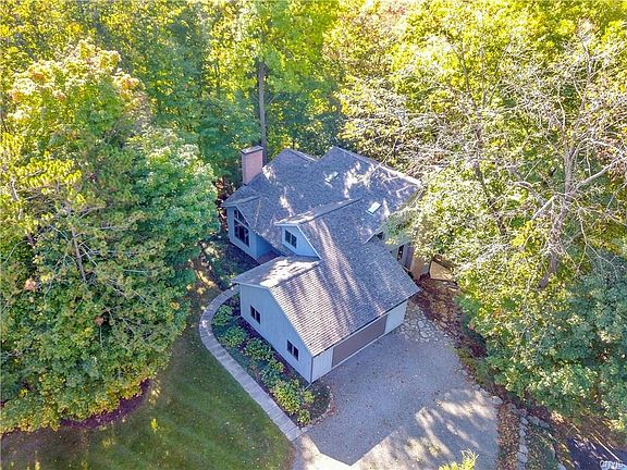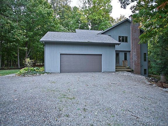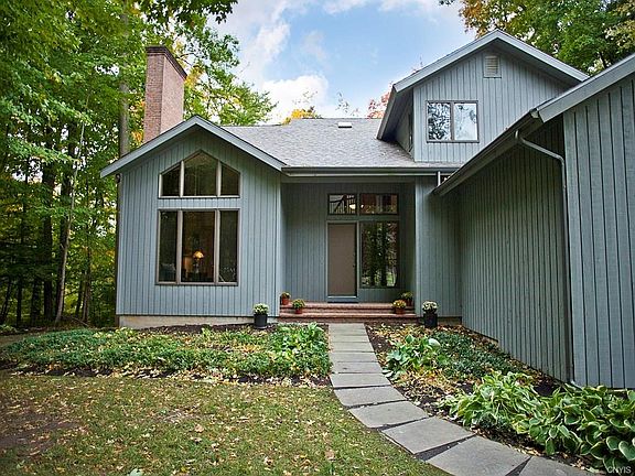 Tucked away on a neatly landscaped wooded lot is this 4 bedroom Contemporary situated to complement the natural environment. Expansive windows, soaring ceilings, clean lines and open spaces are highlighted by abundant natural light, rich hardwood flooring, and architectural angles, offering a harmonious connection to the world outside. The feeling of openness extends into the vaulted great room featuring a brick floor-to-ceiling wood burning fireplace, and flows throughout the dining room, kitchen and living areas to the centrally located exposed staircase. Fresh, neutral walls and contrasting wood trim make it easy to focus on what's important. An upper balcony and the enormous back deck are surrounded by towering trees, providing elevated privacy. Convenient side entrance with small deck is accessible from the extra-wide driveway which has plenty of turn-around space. Property has a brand new roof, 1400 additional square feet in the unfinished basement, and is located in the award-winning Fayetteville-Manlius School District.