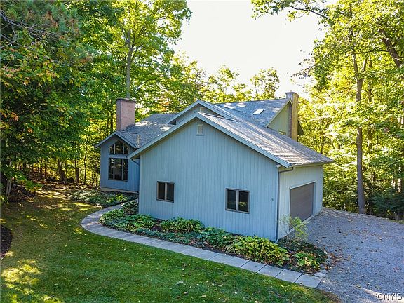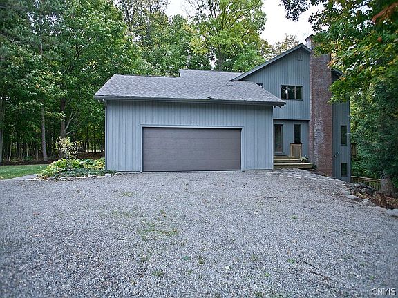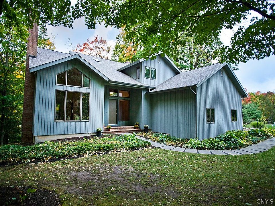 Tucked away on a neatly landscaped wooded lot is this 4 bedroom Contemporary situated to complement the natural environment. Expansive windows, soaring ceilings, clean lines and open spaces are highlighted by abundant natural light, rich hardwood flooring, and architectural angles, offering a harmonious connection to the world outside. The feeling of openness extends into the vaulted great room featuring a brick floor-to-ceiling wood burning fireplace, and flows throughout the dining room, kitchen and living areas to the centrally located exposed staircase. Fresh, neutral walls and contrasting wood trim make it easy to focus on what’s important. An upper balcony and the enormous back deck are surrounded by towering trees, providing elevated privacy. Convenient side entrance with small deck is accessible from the extra-wide driveway which has plenty of turn-around space. Property has a brand new roof, 1400 additional square feet in the unfinished basement, and is located in the award-winning Fayetteville-Manlius School District.