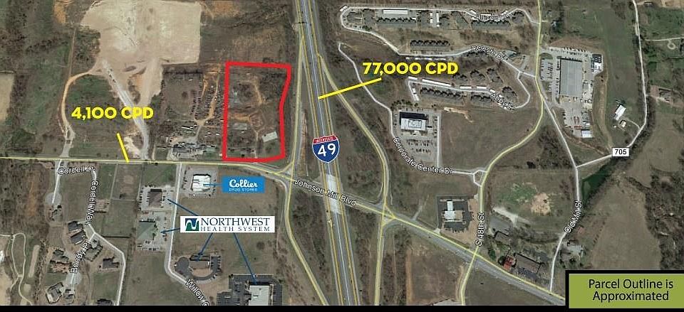 Approx. 5.71 Acres with 300' of frontage on Johnson Mill Blvd. Water & sewer at the corner of Johnson Mills & I-49. Great visibility on I-49. 77,000 CPD. Near Northwest Health Medical Complex. Located in Johnson. Minutes from Fayetteville, AR