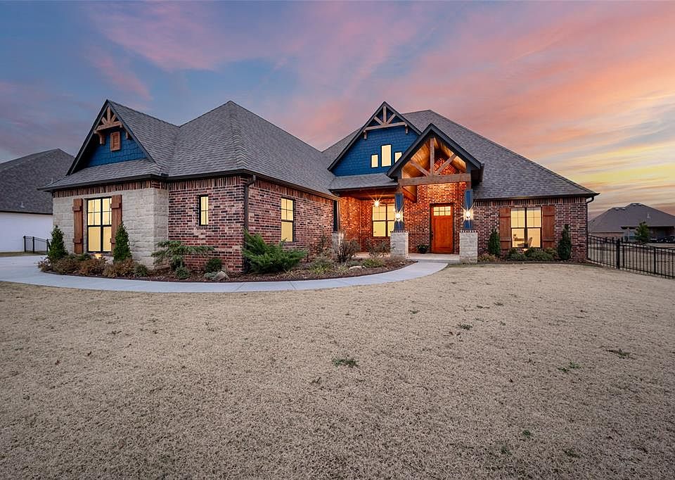 This exquisitely appointed, truly custom home offers thoughtfully designed spaces for every need, an unceasing list of upgrades, and a prime location perfect for anyone looking for luxury in SW OKC. The large dining room welcomes you into the home as it opens to the living room, stone fireplace, and picture windows. Gorgeous real wood floors provide warmth and texture for the spaces which are soaked in natural light. The gourmet kitchen showcases impeccable white marble countertops, tuxedo-look navy and white cabinets, stainless appliances, including an under-counter ice maker, custom tile backsplash, and pot filler. A true mother-in-law plan, the three guest rooms are on the east side with walk-in closets, one en-suite bathroom, one Jack-and-Jill bathroom, and a playroom situated between them. The master bedroom on the west side provides plentiful space, a massive closet with stained custom shelving, and a spa-like bathroom. The bathroom features heated floors, dual vanities, a large soaking tub, and an exceptional shower complete with a bench, traditional showerhead, rainfall showerhead, and four body sprayers. A well refined study with French doors and wainscoting is the ideal place to retreat and concentrate. Upstairs is the ultimate flex room, perfect for games or movies with sound dampening material in the walls and floors. The bar works flawlessly with a built-in microwave, hidden mini-fridge, hidden ice maker, and sink. A full bathroom with heated floors and a similarly upgraded shower completes the upstairs retreat. The expansive four garage bays each feature 8-foot tall by 10-foot wide doors with 25 feet of depth, plus an in-ground storm shelter. The back patio is ideal for outdoor entertaining with a large covered area, ceiling fans, and fireplace. Upgrades abound with things like impact-resistant shingles, spray-foamed attic and garage, pre-plumbed gas lines for generators and pools, tankless water heaters, and too many more to list. Owner associates.