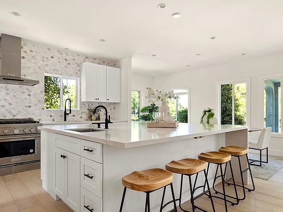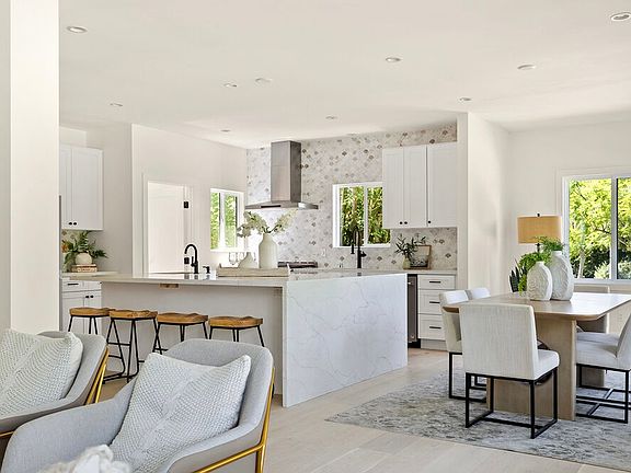 At the heart of the home the custom kitchen boasts a stunning rainfall Calacatta Verona quartz countertop covering a huge center island with seating for four, a standalone wine fridge and a separate bar sink in dramatic black stainless steel.
