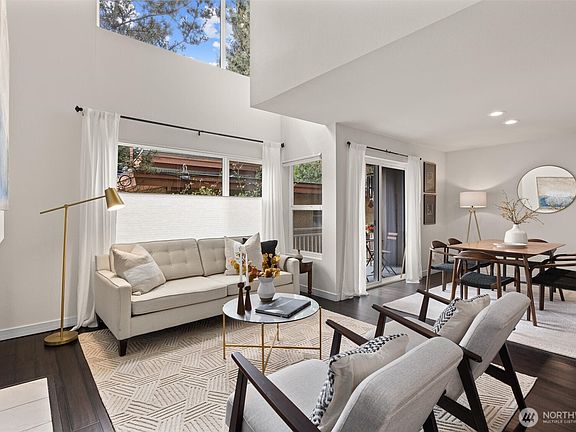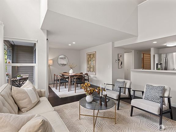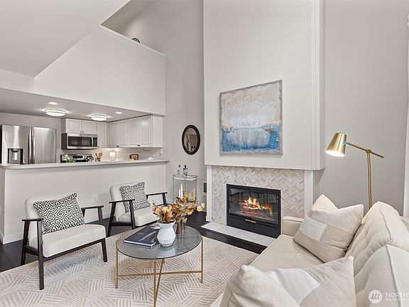 Bright, height, and style — this unique top-floor, 2-story condo near Discovery Park lives more like a townhome. Soaring ceilings and an airy, open layout welcome you in. Main level living features a cozy gas fireplace, dining area, private balcony, full bath, guest bedroom/den, and in-unit laundry. Upstairs, the expansive primary suite offers a second balcony, walk-in closet, bonus closet, and ensuite. A bright open loft adds flex space for an office or fitness nook. Hardwood floors throughout. TWO secure garage parking spots plus storage. EV charger available for residents. Boutique 10-unit building overlooking Kiwanis Ravine, with easy access to Met Market, Magnolia Village, Queen Anne, Ballard, The Locks, Fremont, and downtown Seattle