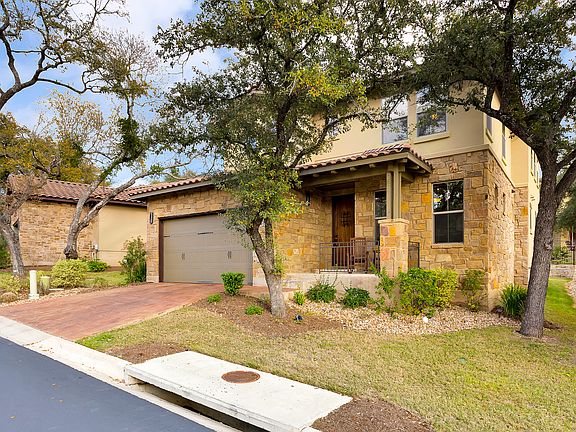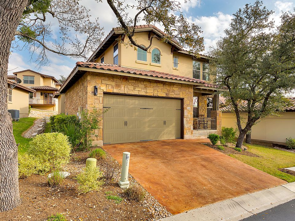 Beautiful garden home in the Falconhead Golf Club community that lives like a one story! The master, another bedroom, office, and laundry are down, while the second living area and two bedrooms are upstairs. One of the few homes in the community with a fireplace. Separate master closets. Owners' upgrades include wood floors, enlarged back patio, gutters, plantation shutters downstairs and central vac throughout. Great location! Close to schools, restaurants, shopping. Agent related to sellers.