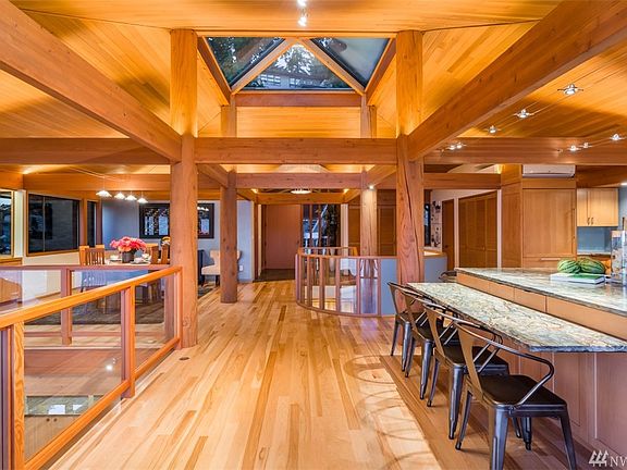 Sunny west facing waterfront~Stunning remodel by Peter Davis of a classic Jerry Gropp design sits prominently on the Island's coveted Gold Coast. An open, circular center staircase framed by rustic beams is complimented by a massive pyramid shaped skylight. Organic yet thoughtful in its approach. Spectacular views beckon you to the waterfront. A dream Kosher kitchen has commercial grade appliances, an enormous island, exotic slab granite counters. Hand selected NW woods blend with Hickory floors.