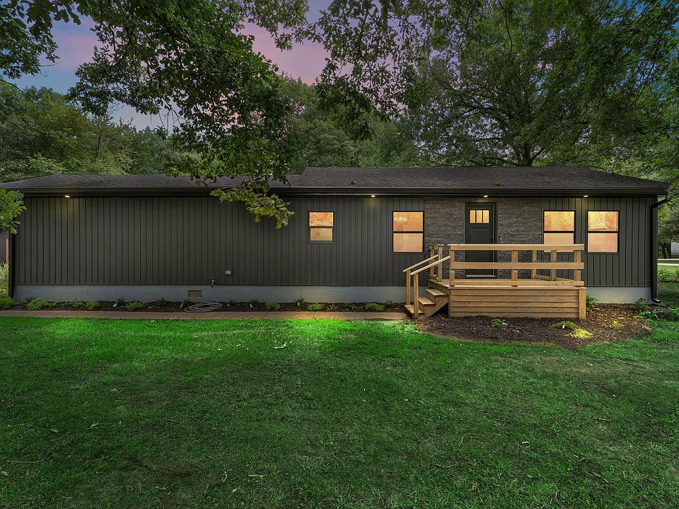 Totally Renovated 3-Bedroom Ranch - Move-In Ready! Welcome to this beautifully renovated 3-bedroom, 2-bathroom home offering 1,274 sq ft of stylish modern living. Nestled on a peaceful lot surrounded by mature trees, this home combines a fresh, updated interior with inviting outdoor spaces.Step inside to find an open-concept layout with brand-new finishes throughout. The spacious living room features sleek recessed lighting, new flooring, and plenty of natural light. The chef's kitchen is a showstopper with a large center island, modern pendant lighting, custom cabinetry, and stainless steel appliances. French doors off the kitchen open to the deck, perfect for entertaining or enjoying quiet evenings outdoors.The home boasts three generously sized bedrooms and two fully updated bathrooms with contemporary fixtures and finishes. Every detail has been thoughtfully designed for comfort and style, making this home truly move-in ready.Outside, you'll love the charming curb appeal with fresh landscaping, a welcoming entry deck, and a large backyard ready for play, gardening, or gatherings under the trees.