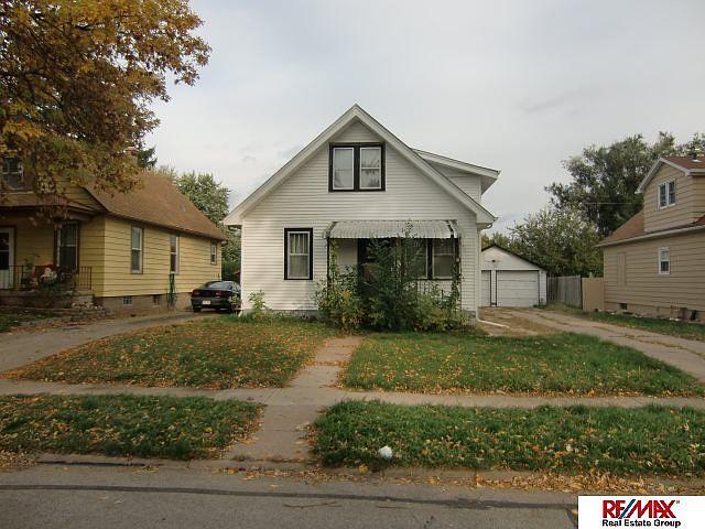Two story home with a covered front porch. The driveway is long & can hold several cars, there is also a detached garage.