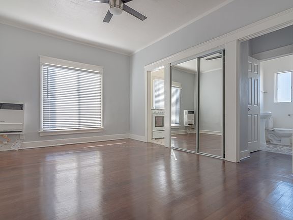 Ceiling fanShower with bathtubVinyl wood-style flooringWall heater