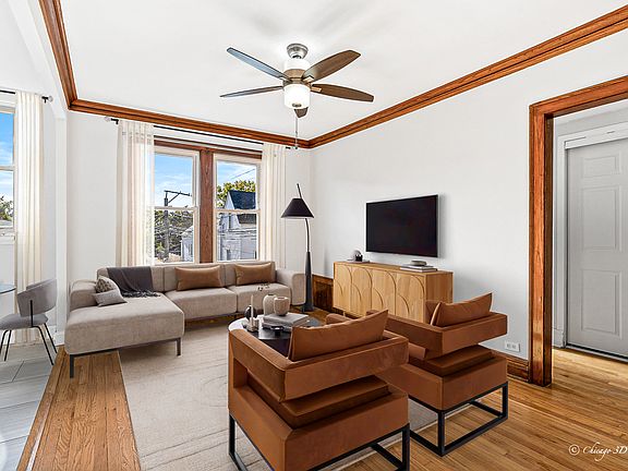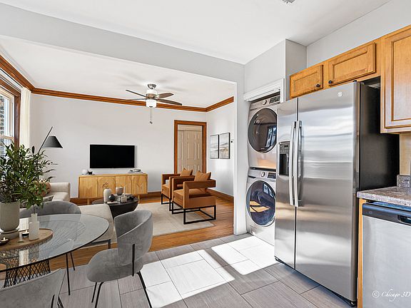 Own for less than you would rent! Welcome to 4309 W Roscoe Street - a stunning corner condominium set within a beautiful vintage building that flawlessly blends timeless charm with modern comfort. This 2-bedroom, 1-bath home is one of the best units in the complex, featuring high ceilings, rich hardwood floors, and the warm character that defines classic Chicago living. Step inside and feel the comfort of this inviting space. The spacious kitchen is perfect for cooking and entertaining, complete with couple months old stainless steel appliances, generous counter space, and abundant cabinetry. The southern exposure and double-pane windows fill the home with natural light while ensuring quiet and energy efficiency. The unobstructed views and tall ceilings create an open, airy atmosphere that makes the home feel expansive and full of life. Both bedrooms are bright and comfortable with excellent closet space - and the second bedroom includes mirrored panels inside the closet, adding a touch of elegance and depth. Central air conditioning and five years old in-unit washer and dryer bring every modern convenience to this timeless space. As a top-end corner unit, you'll enjoy added privacy and your own private porch with an unobstructed view of the quiet neighborhood , perfect for morning coffee or evening relaxation. Downstairs, a good maintained common area is perfect for summer BBQs and outdoor gatherings, and a generous private storage unit adds valuable space for your extra belongings. The location is unbeatable - just one block from Kilbourn Park, minutes to great schools, and walking distance to the Grayland Metra Station and the Blue Line. With easy access to the 90/94 expressway, you're only minutes from O'Hare International Airport or Downtown Chicago. Nestled in one of Chicago's most bike-friendly corridors, with new barrier-protected bike lanes on Milwaukee Avenue just steps away. Investor-friendly, full of vintage charm, and completely move-in ready, this home perfectly balances historic architecture with modern updates. With its high ceilings, bright southern exposure, and incredible location, 4309 W Roscoe Street is truly one of the most desirable places to call home in the area - and one you won't want to miss.