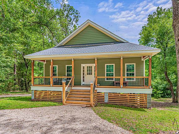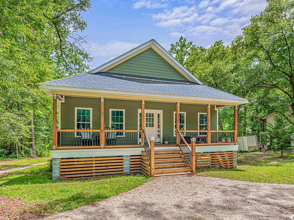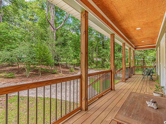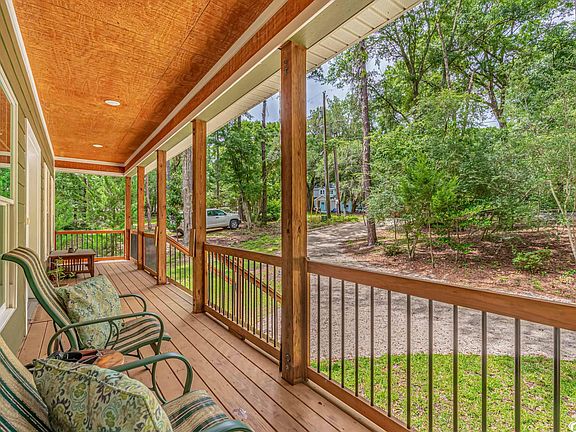 This unique raised country cottage with its solid 4 x 6 construction and Hardi board siding, rests on nearly an acre of land with a walking path down to the creek which is fed from the Waccamaw River that’s only a short distance down the road. This well laid out 2 bedroom 2 bathroom home is on a quiet dirt road surrounded by trees. The circular driveway allows for plenty of parking. You can even park a boat or an RV in your yard and you will find plenty of storage space under the home. The welcoming low country front porch is perfect for relaxing or inviting neighbors over for a cold glass of sweet tea. As you enter the wide foyer and hallway with 9 ft ceilings and real wood paneling that flows throughout the home, you may feel like you are nestled in a treehouse while still living with quality finishing touches, such as solid surface countertops and stainless steel appliances. This solid home has a split bedroom floor plan with an open concept. The spacious laundry room is central to the home. There is an unconventional space downstairs with a bathroom currently used as a bedroom but could be used as office space and it is not included in the square footage. There is a large back porch nestled amongst nature where one can sit listening to the birds, owls and maybe even catch an eagle in flight! Enjoying the peaceful surroundings may just be your new favorite pastime. This home is located in the highly desirable Hagley Estates neighborhood where you can enjoy country living close to the beach!