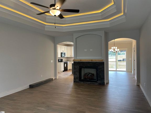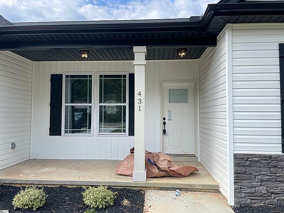 Check out this black & grey new build in Campobello! This home is 1800+sqft 3bd/2bath with an office, and sits on a flat 0.79acres. Thehouse'scurb appeal reflects the builder's attention to detail and quality. Upgraded exterior stone and soffit lights will give the home a warm glow at night.The covered front porch is perfect for rocking chairs and your fall decor. Entering the home, a stone fireplace proudly takes the focal point in the great room. Arches stylishly frame the fireplace and guest room hallway. With the additional tray ceiling, rope lighting, and neutral laminate flooring, this is an impressive entrance! Soft grey, black & white flow from room to room creating a cohesive design. The white kitchen has granite countertops and ample space around the island. The dining area opens up to a spacious covered deck. Room enough for extensive seating and a separate grilling area, this outdoor space is perfect for chilly fall evenings around a gas firepit.