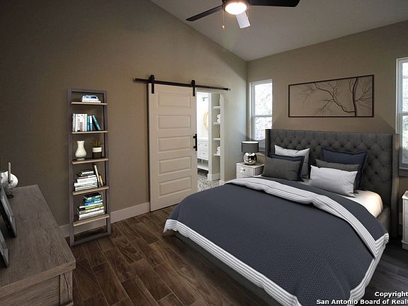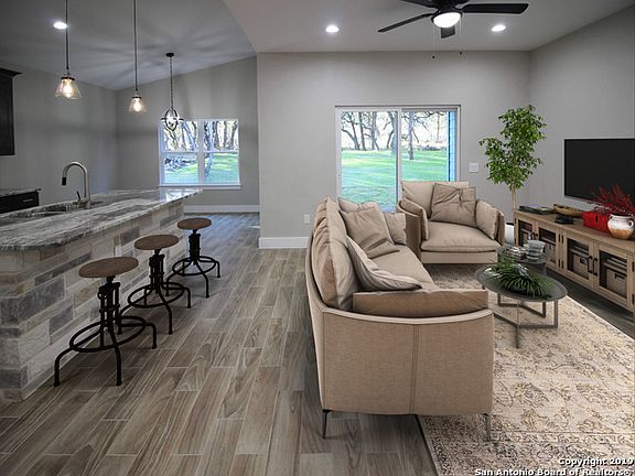 Brand new modern single story home nestled among mature trees on a cul-de-sac in a Guadalupe riverfront community. Backs to a greenbelt, designer touches throughout including granite, soft closing 42" kitchen cabinets, stainless steel appliances, his/hers master vanities, plumbed for water softener, covered patio, walk in master shower w/bench, walk in mstr closet, vaulted ceilings, radiant heat barrier, 16 seer AC, walk in pantry. Moments to boat ramp, pool, park, sports court, & pond. 1-2-10 home warranty