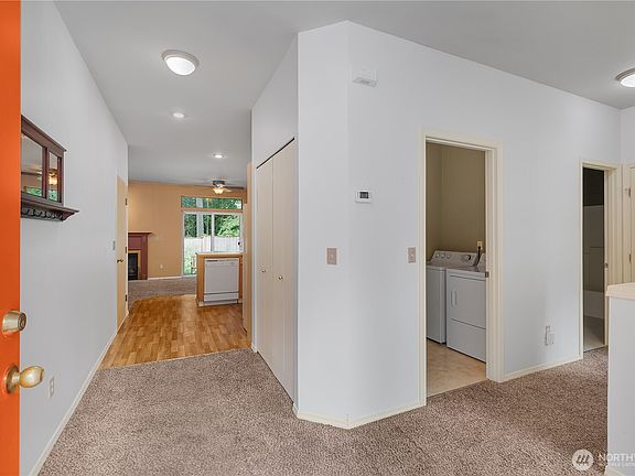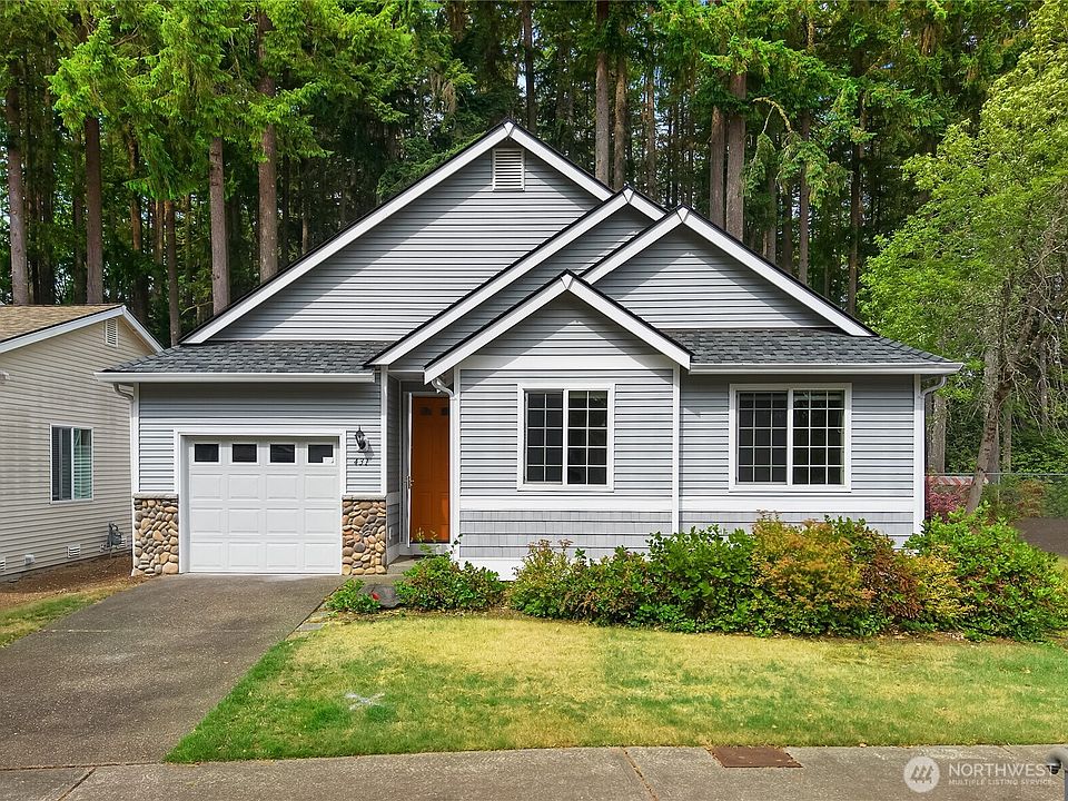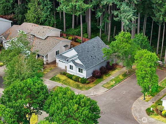 Desirable one level living located in the popular Grass Lake neighborhood, just minutes from restaurants, shops and medical offices. This cute home is privately located on a corner lot bordering the woods. Two bedrooms plus a "bonus" room that makes a perfect office space. Open concept layout with cozy gas fireplace. Luxurious primary suite offers double sinks, a soaking tub, shower and large walk in closet. Step outside into the fenced backyard and you will be treated to beautiful native northwest foliage, tall lush evergreens, tons of birds and wildlife! Sidewalks throughout the neighborhood and a nature trail just around the corner. Truly a special spot. A new roof was installed in March, 2025. The HOA maintains the front yard.