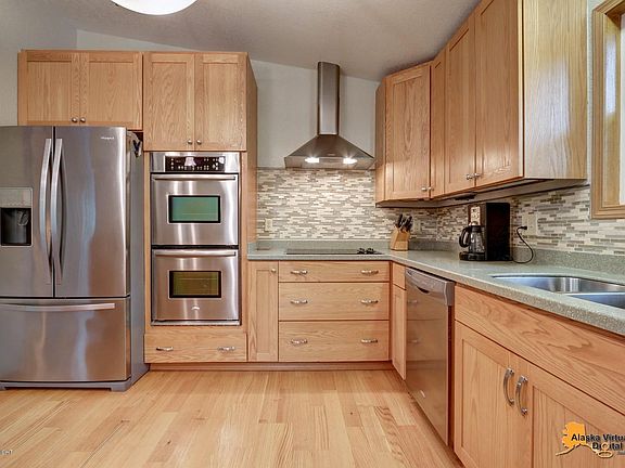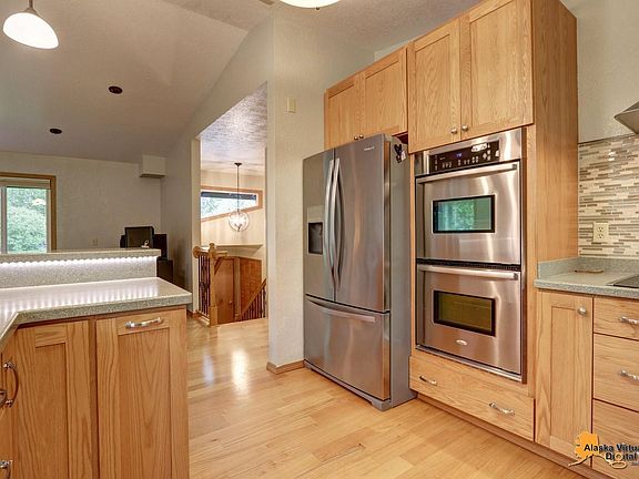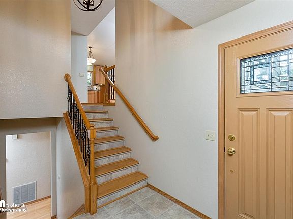 A classic design with expanded entry way, upgraded vinyl windows, laminate flooring, and open kitchen with 42'' solid wood cabinets, an island breakfast bar, glass tile backsplash, & SS appliances incl double ovens & a wall mount range hood. The two bathrooms have also been remodeled with hickory cabinets and a custom tile/glass shower upstairs with double sinks and private access to the master.