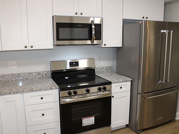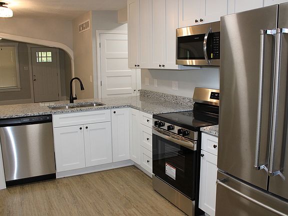 Completely remodeled 3 bedroom and 2 new full bath with beautiful tub surrounds and vanity in Independence, MO. Near W White Oak St and W Truman Rd. Open concept screened in front porch w/new windows. Kitchen nicely re-done with granite countertops, many cabinet spaces, MICROWAVE, STOVE, REFRIGERATOR, DISHWASHER. Has laundry on main level, full unfinished basement and Big 2 car detached garage. Central heating and AC and washer-dryer hookups.