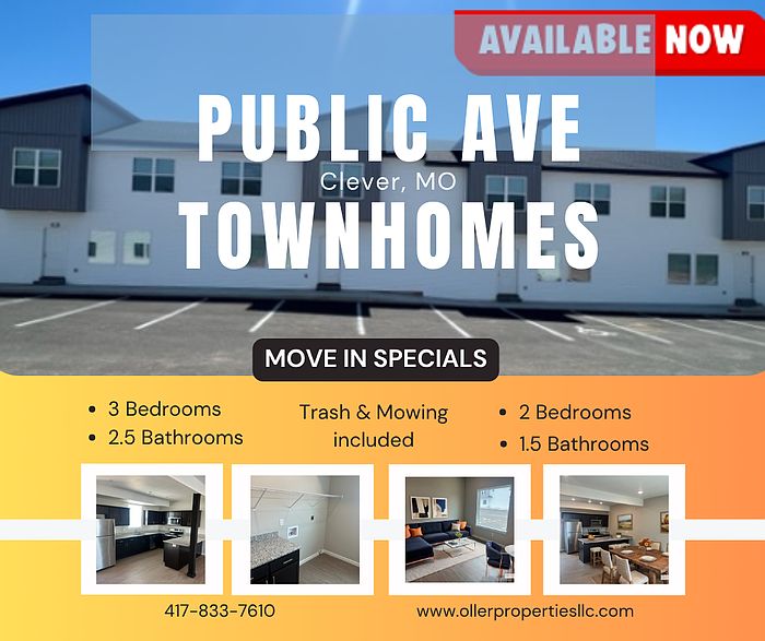 Welcome to the charming Public Ave Townhomes in Clever! This spacious unit features 2 bedrooms and 1.5 bathrooms, offering comfortable living in a quiet, family-friendly neighborhood.
