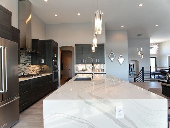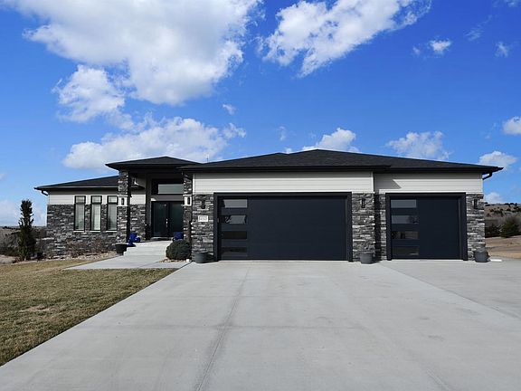 UNIQUE OPPORTUNITY. This contemporary, luxurious home located in the Eagle View Estates community is now available. This property is a work of art! Featuring over 3,300 sq. ft. on each level (more than 6,600 sq. ft. total) resting on 6.82 Acres with incredible western exposure for magnificent sunsets year round. The open floor plan offers plenty of space for all your entertaining needs with show stopping views that will take your breath away. This home boasts 5 large bedrooms, 4.5 bathrooms, an office, a downstairs bar with a built-in wine fridge, and an extra-large gym furnished with floor-to-ceiling mirrors that can easily be converted into additional bedrooms. The home’s exterior flaunts stacked stone and a grand covered entry with unique modern elements including light fixtures. In addition, the front has a large concrete drive with additional parking on the side of the 3-car garage to store any recreational vehicles, trailers, or other large equipment. The home’s Interior possesses artful niches, high-end finishes, and modern fixtures. The open gourmet kitchen creates an ambiance that is great for hosting. This inspired kitchen complete with darker European-style cabinetry, a beautifully contrasted quartz waterfall counter top, mosaic-tiled back splash, touchless faucet, 5-burner gas stove, and stainless steel appliances. The adjacent over-sized walk-in pantry provides ample storage for all your kitchen staples. The layout of this estate creates a smooth flow with easy access from the kitchen to living area or dining room. Adjacent to the kitchen and dining area is a large deck with sliding doors to amplify the indoor-outdoor living opportunities. The western-facing deck touts a custom built-in motorized remote shade screen to protect from wind and light making outdoor enjoyment of views possible year-round. The large primary bedroom resides on the opposite side of the covered deck with sliding door access to enjoy your morning cup of coffee or stargazing before bedtime. This over-sized bedroom features a sitting area with plenty of natural light, custom shades to provide complete privacy, and a tableau window with decorative accents that add a creative modern artistry to the room. The elegant master bath is accented by a dual-sink vanity with high-end lighted mirrors, a stunning soaking tub, a large walk-in shower with built-in niches and bench, and a private toilet area. Directly within and attached to the bathroom is a massive walk-in closet with plenty of space for all your storage needs. On the opposite side of the home behind the kitchen are two bedrooms with a bathroom between. The great room has a floor-to-ceiling stone wall with a modern horizontal gas fireplace with a color scheme that beautifully aligns with the exterior of the home. Near the foyer by the home’s entry is an extra large, stunning office with arched niches, rich hardwood floors, natural light galore, and built-in window shutters. The lower level includes an expansive media area, and a massive guest suite with attached bathroom and walk-in closet. The sliding doors lead to the outdoor paved fire pit with extraordinary retaining walls. This estate offers plenty of privacy and is less than a 10-minute drive into town. The owners also own the adjacent 5 acres which are also available for sale offering plenty of room to have horses, create ATV trails, or build a barn or workshop. The possibilities are endless!