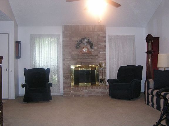 A spacious living room with fireplace and high ceiling adjacent dining area, efficency kitchen with updated appliances, a chef's sink, and breakfast bar. This is a cute home with a large 1st floor master bedroom, with dbl vanity sink, 2 walkin closets a