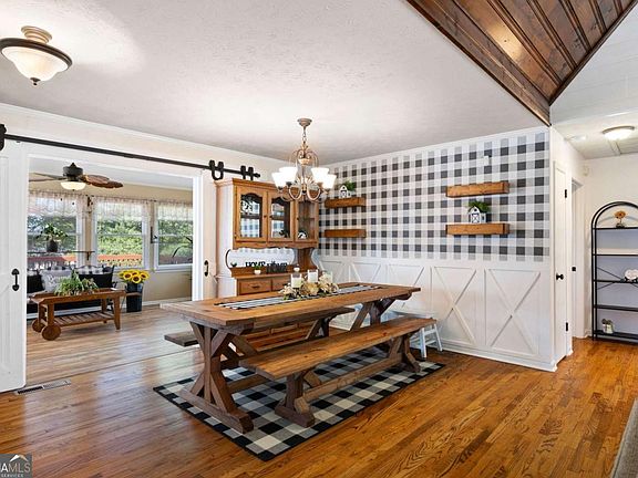 Charming country ranch home on over 2 acres of fenced farm land! Escape to your own private country retreat at 4310 Double Springs Rd SW, a beautifully maintained 3-bedroom, 2-bath farmhouse. Currently used as a goat farm, this property offers multiple sheds, feeding areas, and a fully fenced perimeter-ideal for livestock, hobby farming, or simply enjoying the peaceful rural lifestyle. A covered, rocking chair front porch welcomes you home, offering serene views of the surrounding countryside. Inside, the open yet defined layout features a vaulted wood-plank ceiling and a whitewashed brick fireplace, creating a warm, rustic atmosphere. The dining area features charming chair molding, while barn doors lead to a bright all-season sunroom, perfect for morning coffee or quiet evenings. The galley-style kitchen includes ample cabinet and counter space, a breakfast nook with a bay window, and direct access to a functional laundry room with storage and a workbench. The primary bedroom on the main level features two closets and an ensuite bath with a double vanity and a tub/shower combo. Two additional bedrooms share an updated hallway bathroom accented with shiplap walls. An unfinished, partial basement and encapsulated crawl space with a water filtration system provide extra storage space. Enjoy the view of your land from the expansive back deck, complete with a gravel firepit area and mature landscaping. Additional highlights include a two-car attached garage with PebbleTech flooring and storage, as well as an oversized detached two-car garage that is ideal for a workshop or storing farm equipment. The automatic gated entry and long driveway enhance privacy, making this home a truly peaceful escape. Experience country living at its best, where charm and tranquility meet, just minutes from downtown Monroe's conveniences.