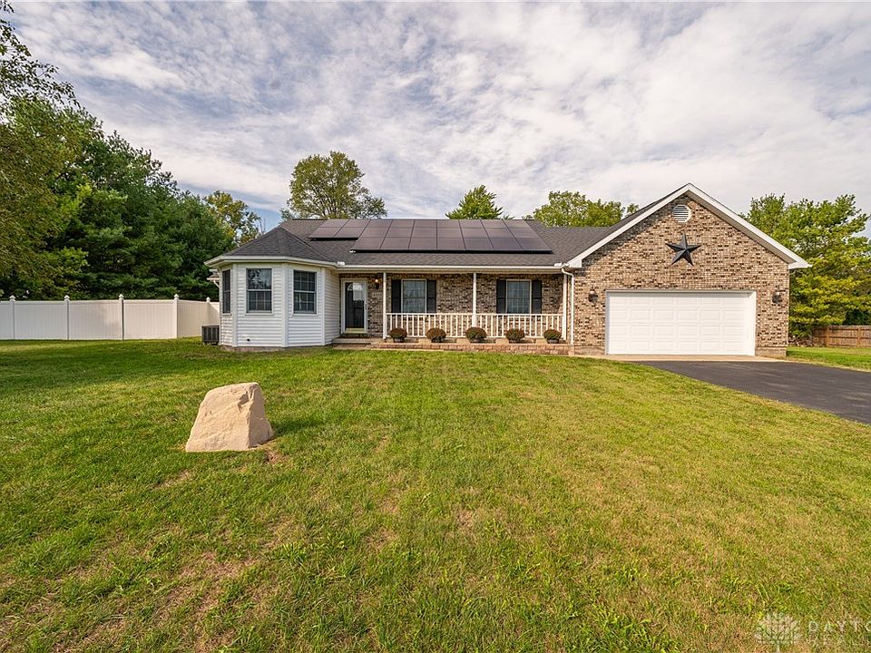 Discover over 3,000 square feet of beautifully finished living space in this exceptional ranch-style home, nestled on a spacious one-acre lot. The front porch awaits morning coffee & rocking chairs. With all bedrooms, bathrooms & laundry thoughtfully located on the main floor, this home offers the convenience of easy, one-level living. The open-concept eat-in kitchen is designed for both functionality & style, featuring granite countertops, stainless steel appliances & ceramic tile flooring for lasting durability. Ceramic tiles extend from the entryway through to the kitchen, while the great room & hallway boast engineered hand-scraped wood floors, adding warmth & character. The great room is a true focal point, w/11-foot ceilings, a cozy gas fireplace perfect for holiday decorating & large windows that flood the space w/natural light. An open dining area accommodates a nice-sized table, making it the perfect spot for hosting family gatherings & entertaining friends. The owner’s suite offers a private oasis w/a luxurious glass-door shower, a soaking tub for unwinding & a walk-in closet to satisfy all your storage needs. Additional full bathroom w/tub-shower combo. The expansive finished basement provides endless options for customization, w/two large rooms that can serve as a theater room, playroom, additional family room, or even a guest suite. An unfinished section offers ample storage space & houses the home's mechanical systems. Outside, you’ll find your own personal retreat, featuring multi-level decking ideal for outdoor entertaining, a storage shed for all your outdoor essentials & a fully fenced backyard where kids or pets can play safely. The attached garage provides extra storage space & a dedicated workshop for those who love hands-on projects. This home is a rare find w/NO HOA & NO city taxes in a desirable township. Plus, the newly installed solar panel system ensures extremely low utility bills, making this home beautiful & energy-efficient.