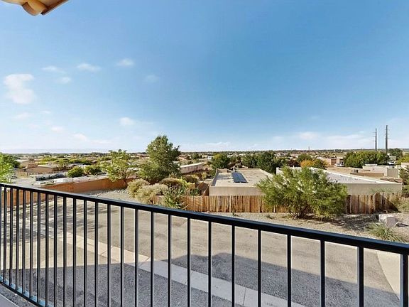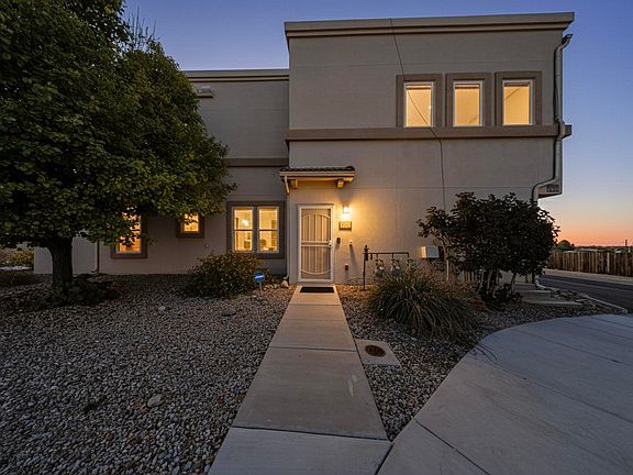 Welcome to this contemporary Southwest-inspired home. This home features modern updates, smart features, and mountain views. It includes a 1-car garage, 10-foot ceilings, updated fixtures, fresh paint, and tile accents throughout the main living, kitchen, and dining areas, with an open floor plan. Engineered vinyl plank flooring extends throughout the main areas. The kitchen has a generous island, pendant lighting, and stainless steel appliances. Both bedrooms feature plush carpet, and the primary bedroom includes a well-organized closet system, with additional shelving in the second bathroom. A dedicated laundry room includes an LG WiFi-enabled washer and dryer. Smart home features include a Yale front door lock, MyQ garage system, Ring doorbell, and Ecobee thermostat. Situated on a quiet cul-de-sac, the elevated corner lot provides views of the Jemez Mountains, sunsets, seasonal snowfall, and summer monsoons. The home receives abundant natural light and airflow throughout. This home is being sold fully furnished, including kitchen, bathroom, and bedroom essentials, along with coordinated furniture and décor—ready for immediate occupancy (including quality kitchen items such as Calphalon cookware and knives, and OXO utensils). The home is located near a local park, shopping, and dining options, with access to I-25 and US-599.