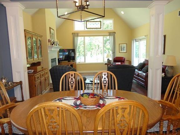 RARE OPPORTUNITY ON CROOKED LAKE! These villas don't come up for sale often. What a great way to enjoy Crooked Lake lakefront but without all the maintenance. The association takes care of mowing, snow removal, pier and more. 4000 sq. ft of home makes for plenty of room for family and friends. Private dead end road with little traffic. Bonus room on upper level is now used as a bedroom, but not included as one of the 3 bedrooms. There is a golf cart/utility room with a garage door on the lakeside for hauling people and provisions down to the boat.