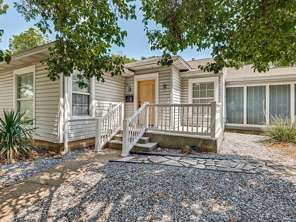 A true opportunity! Charming cottage in North Stonewall Terrace, feeding into Mockingbird Elementary! Wonderful floor plan with a spacious living room, tiled fireplaced and generous formal dining. Crown moldings, recessed lighting, and flush-mounted speakers grace the living room. Arched openings and the vintage telephone shelf in the hallway are a nod to the home's early 1940s origins. Hardwood flooring throughout, except the bath. The kitchen is outfitted with an LG French door refrigerator, LG gas range with griddle and dishwasher. Crisp white shaker cabinets - some with glass fronts - an undermount sink, granite counters and white subway tile backsplash complete the space. The refrigerator and under-counter Duet washer and dryer will convey. The flex room is currently used as a walk-in closet, but could double as a home office, nursery, exercise room... you name it. From the expansive wood deck, enjoy the oversized backyard which offers plenty of room for a pool, and the gated entry to the long gravel drive and detached two-car garage. And for a completely different option: BUILD or expand on this approximately 55' x 160' lot! Walk to DART, Mockingbird Station, dining, retail. Tenant currently in place until 9-30-2025.