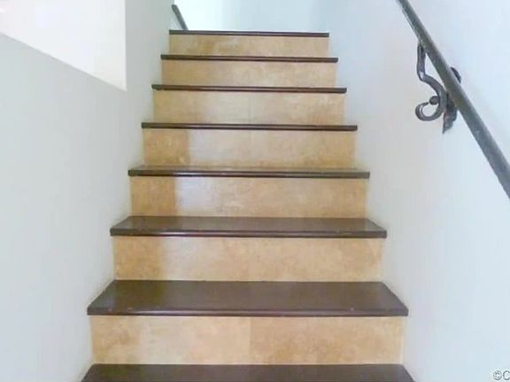 Hardwood and travertine stone tile floors throughout for a sophisticated touch.